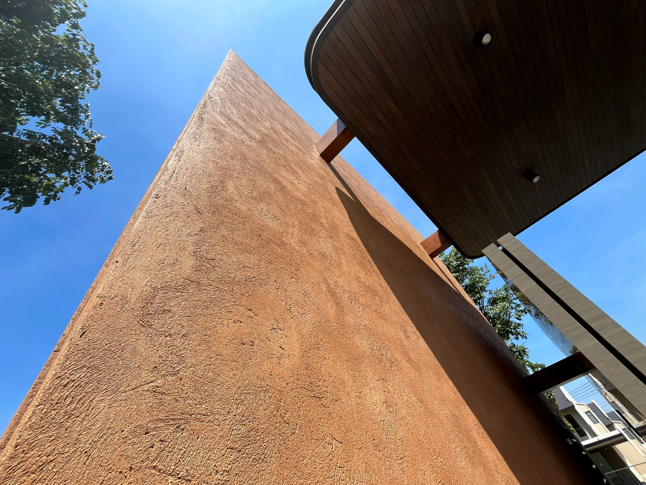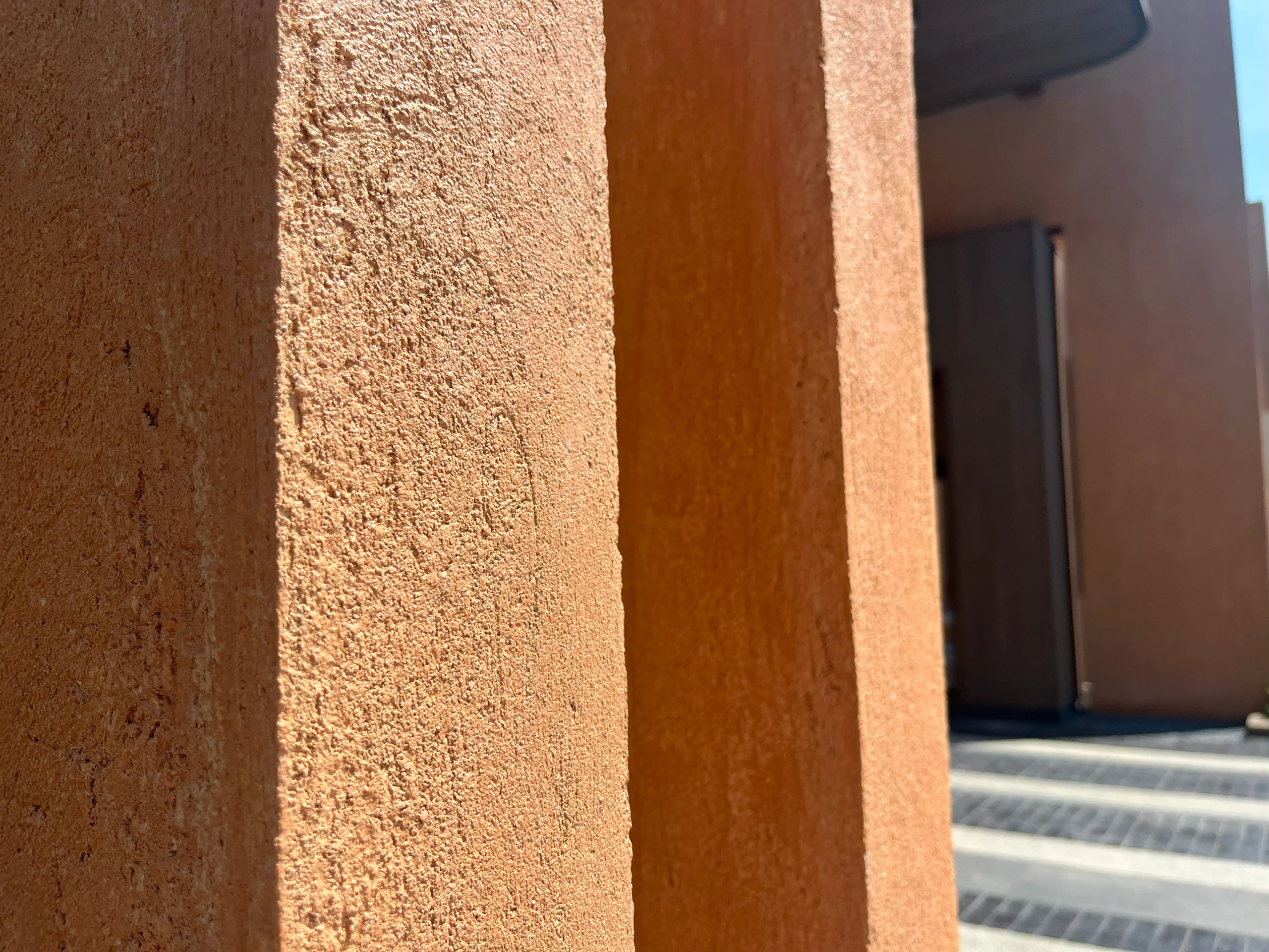 การออกแบบเน้นเอกลักษณ์เฉพาะด้วยการใช้ KEIM Concretal-Lasur โทนสีน้ำตาลธรรมชาติ ผสมเจือจางด้วย Fixativ ทำให้สีซึมและผสานเข้ากับวัสดุอย่างแนบเนียน สูตรนี้ช่วยปกป้องพื้นผิวจากผลกระทบทางสิ่งแวดล้อมทุกรูปแบบ ทั้งแสงแดดและฝน ขจัดปัญหาความชื้นและลดความจำเป็นในการทาสีซ้ำบ่อยครั้ง อีกทั้งเทคนิคนี้ยังช่วยเพิ่มมิติและเสน่ห์ของพื้นผิวให้โดดเด่น เมื่อกระทบกับแสงแดดจะยิ่งสะท้อนเอฟเฟกต์ที่น่าหลงใหล